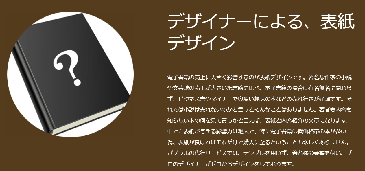 電子書籍の成功には「表紙デザイン」も大きなポイントです。パブフルでは、プロのデザイナーが著者と相談しながらオリジナルの表紙を制作してくれます。