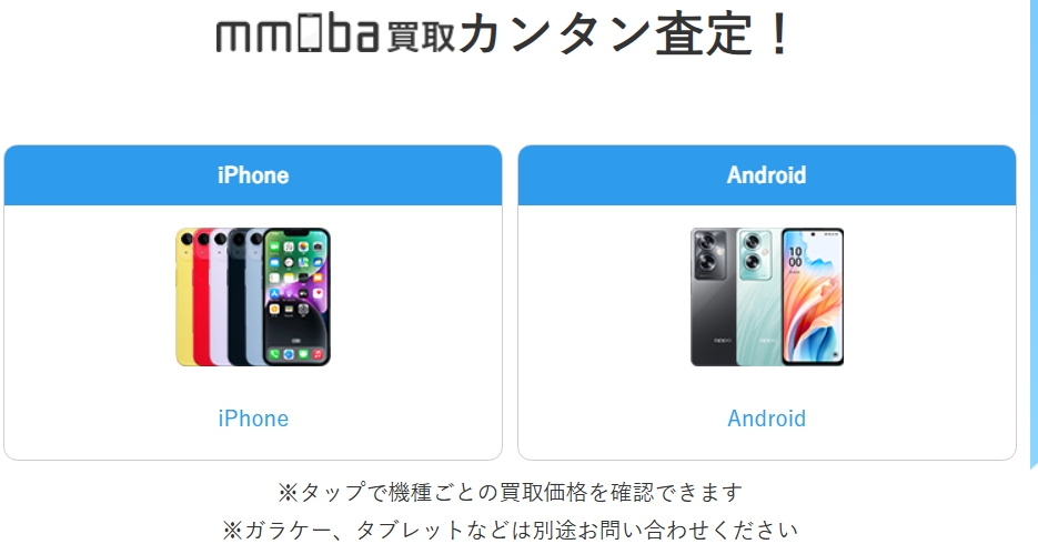 mmobaは中古iPhone、Androidスマホ、さらにはガラケーまで幅広く扱っています。