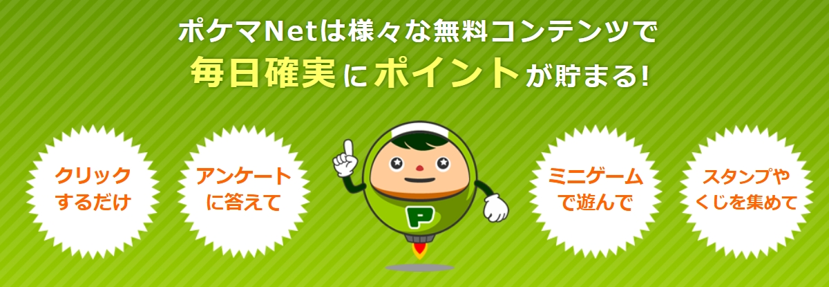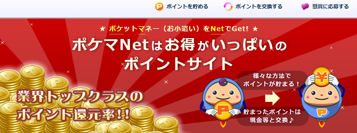 ポケマNetは、ネット上の様々なサービスや広告を利用することでポイントが貯まるポイントサイト(お小遣いサイト)です。 会員登録・年会費は一切不要で、家計の節約・お小遣い稼ぎとして人気があります。日頃のネット利用をそのまま活かして、ポイントをコツコツ貯めていくことができます。 サイト内には色々なコンテンツが用意されており、無料で楽しみながら貯める仕組みが充実しています。
