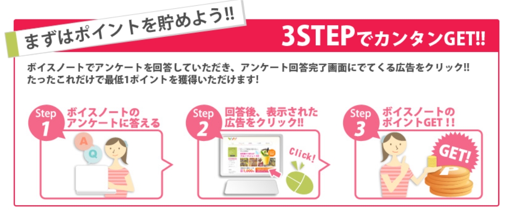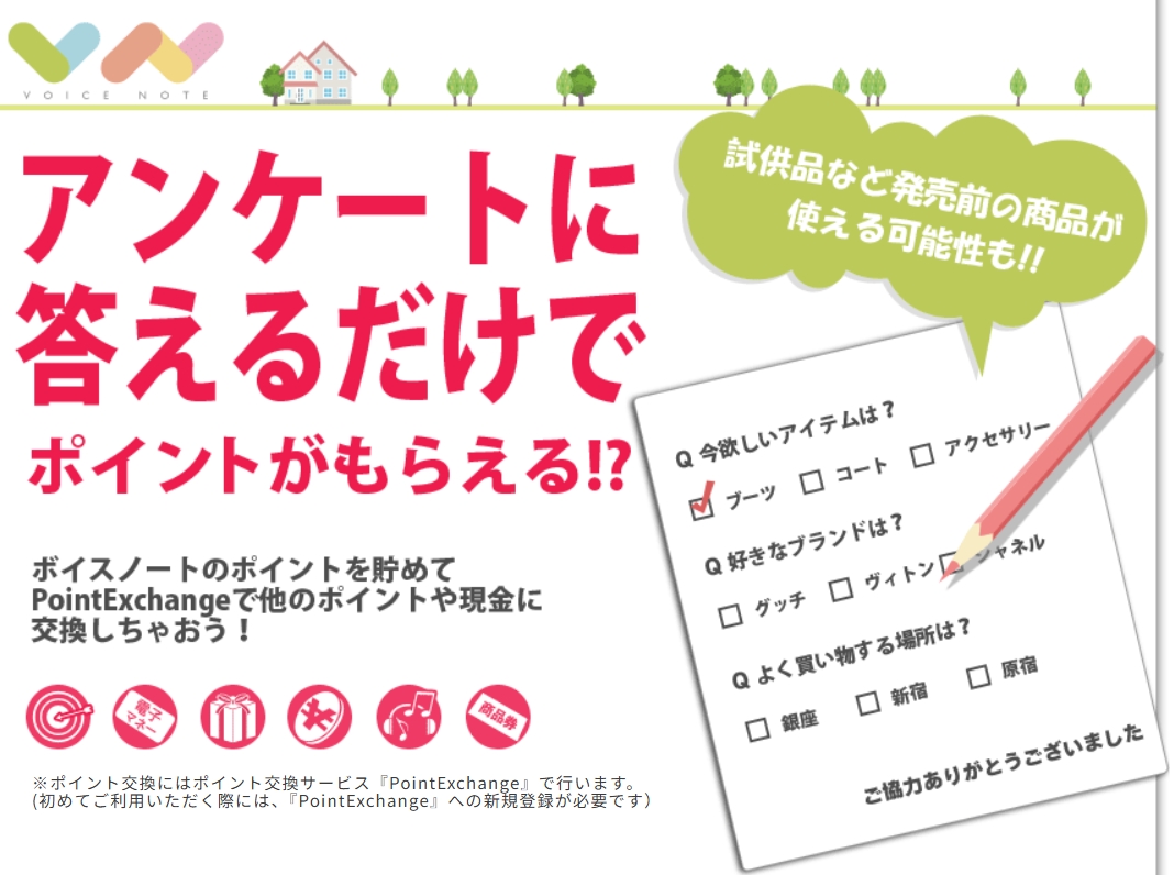 ボイスノートは、さまざまなジャンルのアンケートに答えるだけでポイントをもらえるサービスです。                                          3問程度の簡単なものから、じっくり考えて答えるタイプのものまであり、選べるアンケートの幅が広いのが特徴です。                                  アンケートはスマホ・PCどちらからでも回答できるので、自分のライフスタイルに合わせて参加できます。