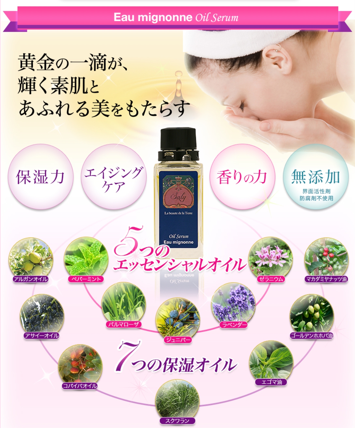 オイルセラムは防腐剤・化学合成油・鉱物油不使用のやさしい処方で、敏感肌の方にも使いやすい設計になっています。 また、精油による自然な香りで、毎日のスキンケアタイムに癒しをプラスします。