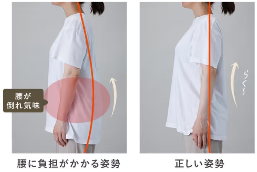 腹部を下から上へ持ち上げる「V字構造」と、背中・腰をまっすぐ支える補正設計によって、姿勢を自然に整え、お腹や背中に過度な負担をかけずにサポートします。