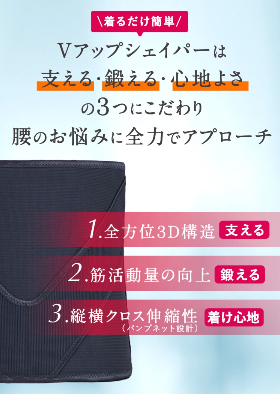 「Vアップシェイパー」は、腹部・腰まわりを引き締めるだけでなく、姿勢や体幹を自然に意識させることで日常生活から美しいシルエットを目指せるシェイパーです。